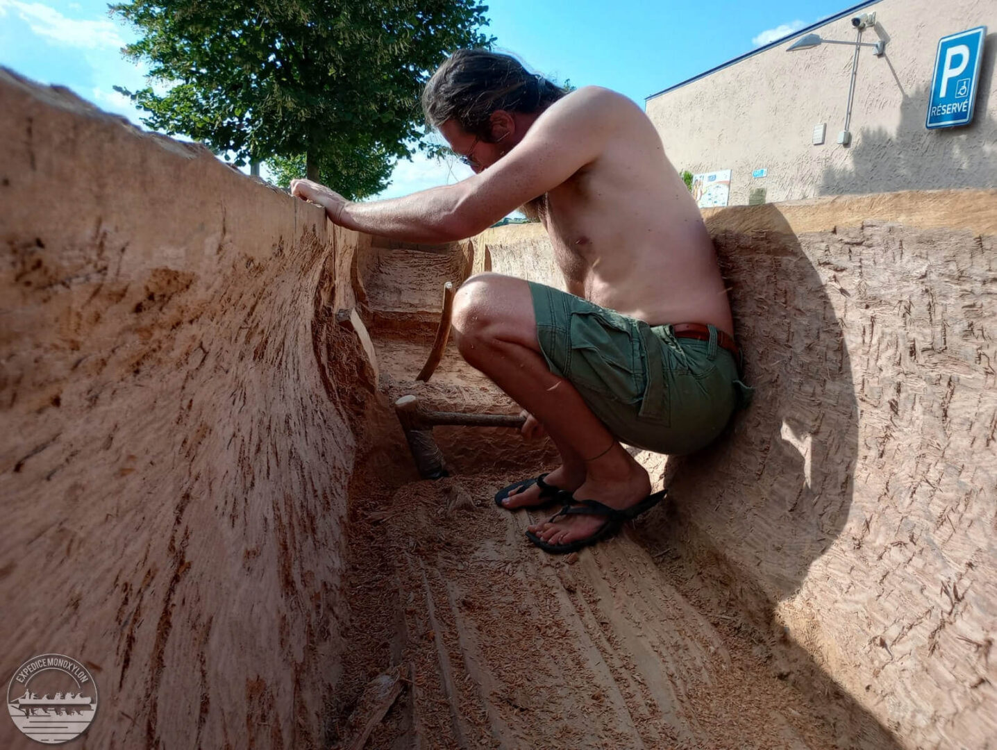 Only thanks to a lucky coincidence, we managed to obtain the massive trunk of the 300 year old oak which had been ripped out from the ground by a violent storm in the forest enclosure named Mochov near the town of Opocno. There, it grew for hundreds of years, looked after by the local foresters. This was such a unique opportunity to craft our largest monoxyl and we started to plan yet another expedition Monoxylon, this time with number IV. Its motto is clear: “The Story of the King of Mochov”.