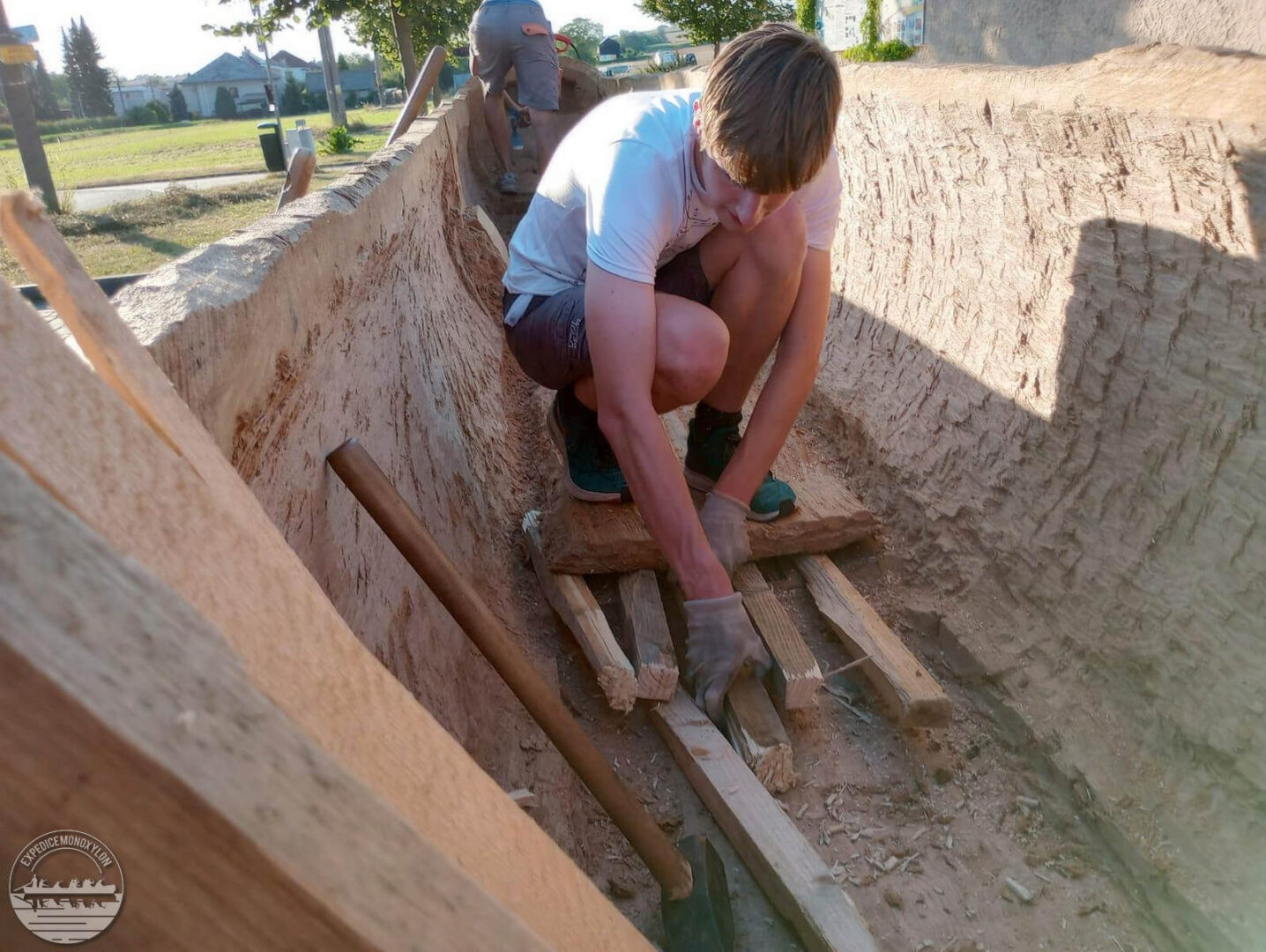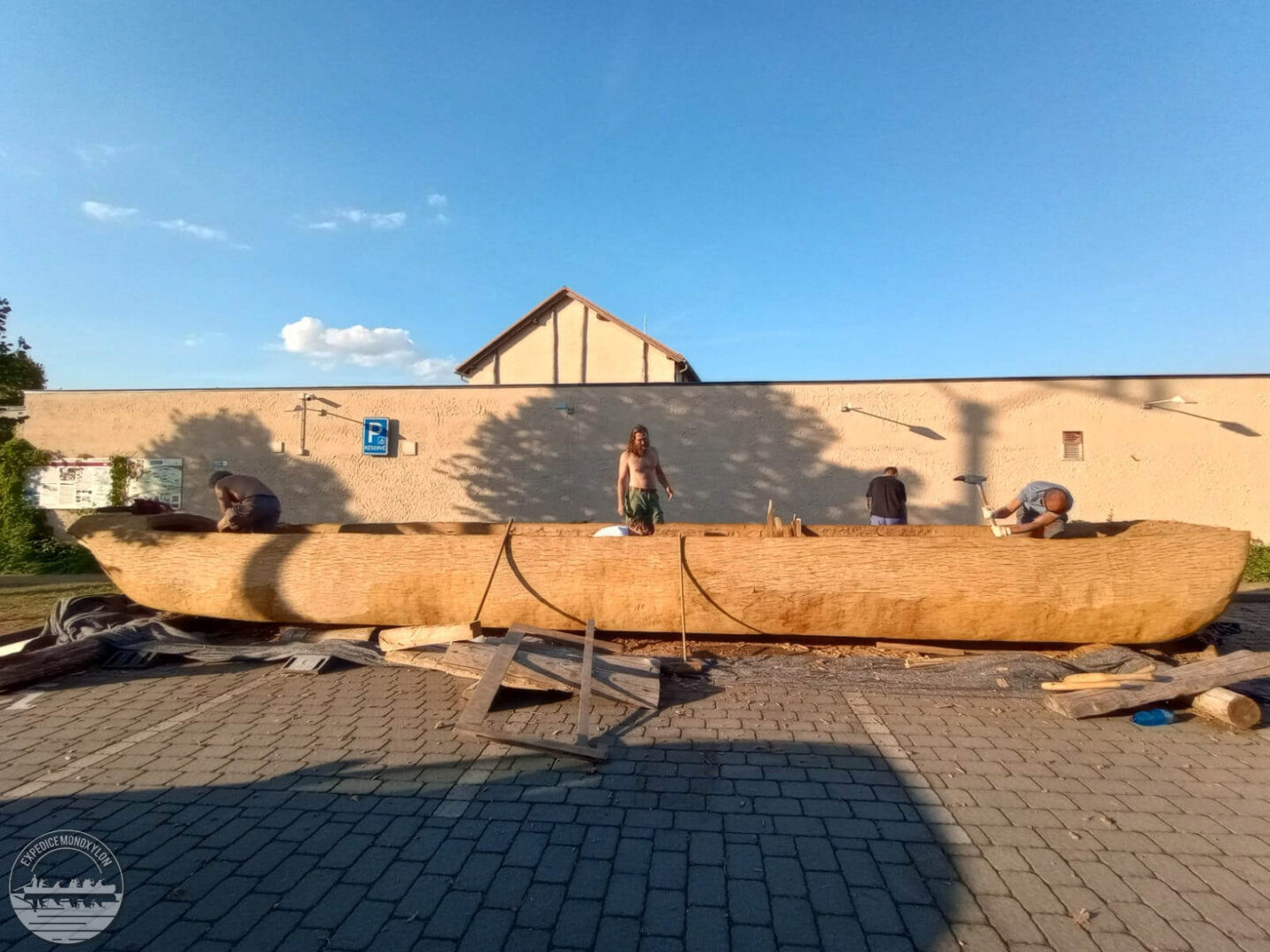 For the whole year 2022 we were working on a dugout boat which could almost precisely fit the dimensions of the dugout – monoxyl found by Italian archeologists in the Lake Bracciano. We tested the new monoxyl in September 2022 on the Czech lake Rozkos, where it was also baptised with the new name: “The King of Mochov”. There it proved to be ready to go on the journey in the tracks of the first Neolitic farmers migrating to Europe and follow their ancient footprints around the chain of the Greek islands between the important archeological sites Cukurici and Franchthi.